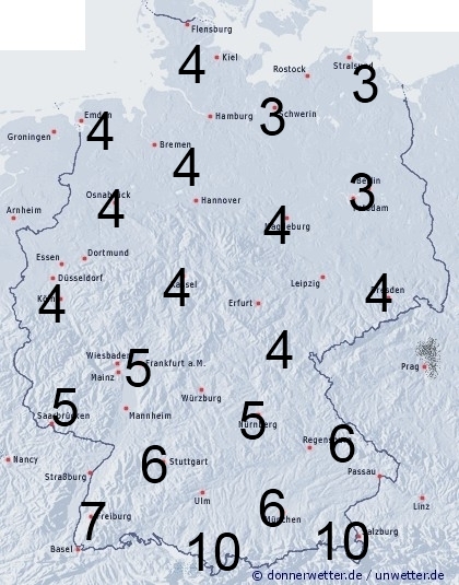 In Deutschland bleibt es überwiegend niederschlagsfrei. Benetzung entsteht jedoch vor allem im Süden durch Feuchtigkeit, wie Tau- oder Reifansatz, gebietsweise auch durch Nebelnässen. Die Benetzungsdauer liegt im Norden bei einem mäßigen östlichen Wind zwischen 2 und 4 Stunden, im Süden zwischen 4 und 7 Stunden, in den Alpentälern auch bei 10 Stunden. Außerhalb von Ortschaften können in geschützten Lagen jedoch noch höhere Werte erreicht werden. Bei einer vorhandenen Schneedecke in den Bergen sind bis zu 24 Stunden möglich.