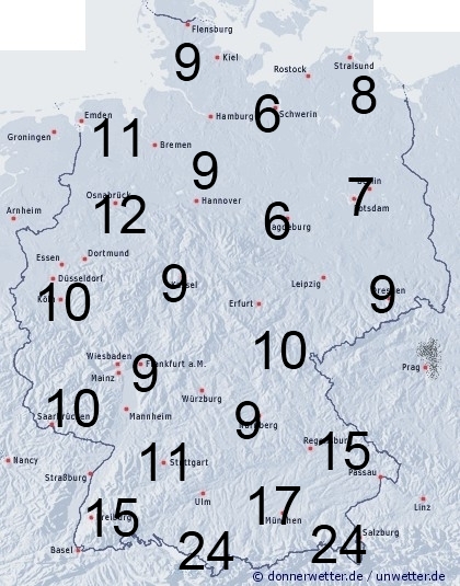 In Deutschland treten weitere Niederschläge oder Schauer auf, die in der einfließenden kälteren Luftmasse teilweise wieder bis in tiefere Lagen mit Schnee vermischt sein können. Die Benetzungsdauer liegt allgemein zwischen 7 und 12 Stunden, ganz im Süden auch über 15 Stunden. Bei einer vorhandenen Schneedecke können bis zu 24 Stunden erreicht werden.
