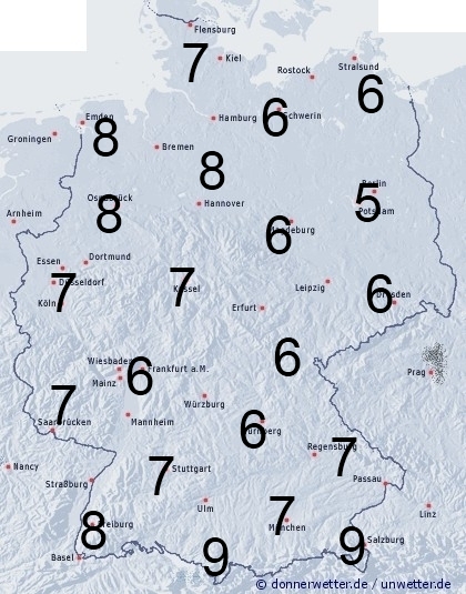Eine von Westen hereinziehende Kaltfront beendet im Tagesverlauf mit ersten Schauern und Gewittern die Frühsommerphase. Sonst entsteht leichte Benetzung durch nächtlichen Strahlungstau. Die Benetzungsdauer liegt in Deutschland allgemein zwischen 5 und 9 Stunden.