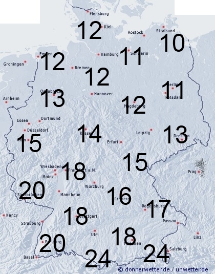 Ein umfangreiches Regengebiet zieht über Deutschland hinweg. Die Benetzungsdauer liegt dabei im Norden zwischen 10 und 13 Stunden, sonst zwischen 14 und 20 Stunden. Bei einer vorhandenen Schneedecke in den Bergen werden bis zu 24 Stunden erreicht.