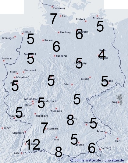Bei auftretenden Regengüssen und nächtlichen Strahlungstau liegt die Benetzungsdauer allgemein zwischen 4 und 8 Stunden, kann aber außerhalb von Ortschaften deutlich nach oben abweichen. Im Schwarzwald können bei längeren Regenfällen auch bis zu 12 Stunden erreicht werden.