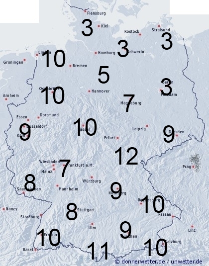 Im Nordosten bleibt es meistens trocken. Hier entsteht leichte Benetzung durch nächtlichen Strahlungstau. Sonst können gebietsweise teils kräftige Schauer und Gewitter auftreten. Die Benetzungsdauer kann dabei stark voneinander abweichen. Bei niederschlagsfreiem Wetter liegt sie meist nur zwischen 2 und 4 Stunden. Bei Regengüssen können zwischen 4 und 12 Stunden erreicht werden.
