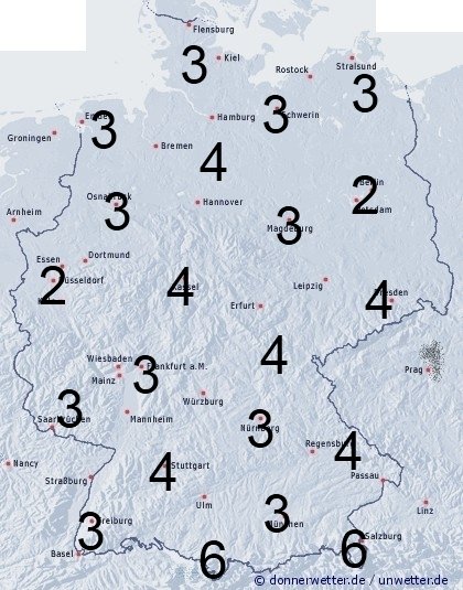In Deutschland herrscht sonniges und trockenes Sommerwetter. Leichte Benetzung entsteht nur durch nächtlichen Strahlungstau. Die Benetzungsdauer liegt allgemein zwischen 2 und 4 Stunden, in geschützten Mittelgebirgs- und Alpentälern können bis zu 6 Stunden erreicht werden.