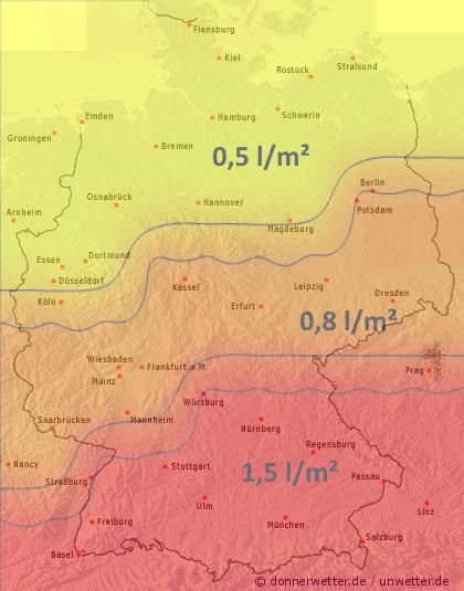 Am Sonntag überquert uns eine Störung von Nordwest nach Südost. Dabei können nahezu im gesamten Land Regengüsse auftreten. Die zu erwartenden Niederschlagsmengen liegen meist so zwischen 1 und 5 Liter pro Quadratmeter. Lediglich am Oberrhein und Neckar scheint es überwiegend trocken zu bleiben.