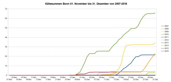 In diesem Jahr wurden die ersten negativen Tagesmitteltemperaturen in Bonn bereits am 29. November gemessen. Ähnlich früh legte der Winter in den vergangenen 10 Jahren nur im Jahr 2013 und im "Kältewinter" 2010 los.