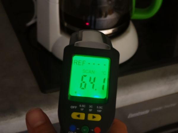 Frisch aufgebrüht erreichte unser Kaffee auf der Heizplatte einer handelsüblichen Filterkaffeemaschine Temperaturen, die sich um den eben benannten "kritischen Bereich" bewegen (s. Bild links).