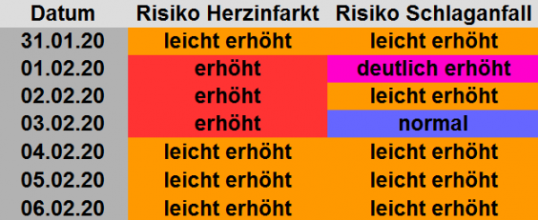 Mit einfließender Warmluft erreichen die Schlaganfall- und Herzinfarktrisiken vor allem am Wochenende ein hohes Niveau. In der neuen Woche sinken die Risiken dann wieder ein wenig, bleiben aber erhöht.