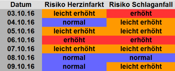 Durch die neue Hochdrucklage und kühle Luft in den Nächten erhöhen sich die Schlaganfall- und Herzinfarktrisiken am Mittwoch und Donnerstag. In Richtung Wochenende ist dann wieder eine Normalisierung in Sicht.