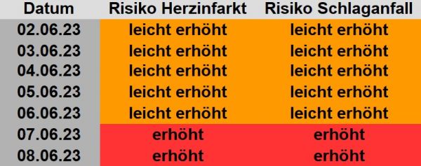 Nach anfänglich nur leicht erhöhten Risiken wartet die zweite Hälfte der neuen Woche mit erhöhten Schlaganfall- und Herzinfarktrisiken auf. Vor allem die einsetzende Schwüle trägt an den hohen Risiken Schuld.