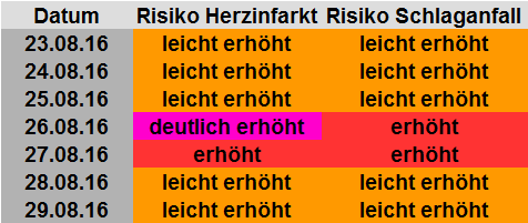Für die Schlaganfall- und Herzinfarktrisiken bedeutet der Einzug des Spätsommers einen eklatanten Anstieg, vor allem am Freitag und Samstag sind die Risiken teils deutlich erhöht.