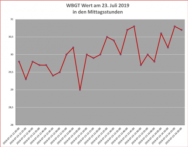 Beispiel: In den Mittagsstunden vom Dienstag, den 23. Juli 2019 lag der WBGT Wert demnach überwiegend im schwarzen Bereich mit einem extrem hohen gesundheitlichen Risiko. In diesen Stunden sollte man Sportaktivitäten vermeiden und ausreichend Flüssigkeit zu sich nehmen. Bei übermäßiger Bewegung kann es schnell zu gesundheitlichen Risiken kommen.