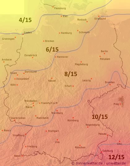 Die Karte zeigt die durchschnittliche Zeckenbelastung innerhalb 15 Minuten in Deutschlands.
