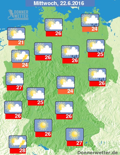 Heute zieht im Osten und Nordosten, gebietsweise auch im Norden teils aufgelockerte, teils starke Bewölkung durch, dabei sind hier einzelne Schauer zu erwarten. Gewitter sind möglich, bleiben jedoch selten. Im übrigen Bundesgebiet ist es verbreitet heiter bis sonnig, hier und da ziehen auch mal mehr Wolken durch, dabei bleibt es, von ganz vereinzelten Schauern oder Gewittern abgesehen, bis zum Abend trocken. Die Temperatur steigt auf 21 Grad in Ostfriesland und 28 Grad im Breisgau.
