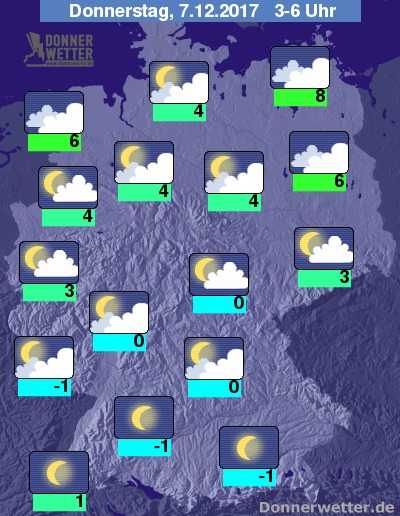 In der Nacht zum Donnerstag halten sich im Küstenumfeld und im Nordosten Deutschland meist dichte Wolken, sonst ist es im Norden und Osten teils stark, teils aufgelockert bewölkt. Im Süden und Westen ist es meist wechselnd bis aufgelockert, im Süden verbreitet nur gering bewölkt bzw. sternenklar. Es bleibt landesweit trocken bei Tiefstwerten von 8 bis -1 Grad.