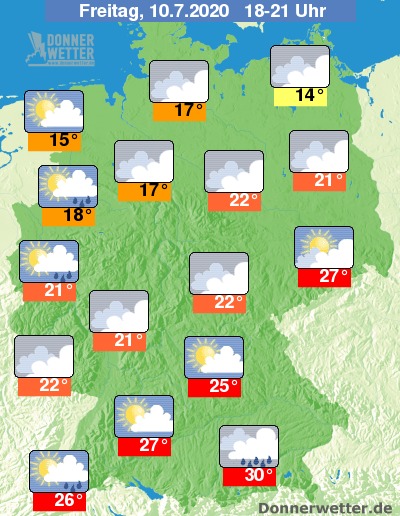 Am frühen Abend gibt es noch große Temperaturunterschiede im Lande. Die Spannbreite reicht von kühlen 14 oder 15 Grad an den Küsten von Nord- und Ostsee und heißen 30 Grad in, sowie rund um München, sofern es noch nicht geregnet hat.