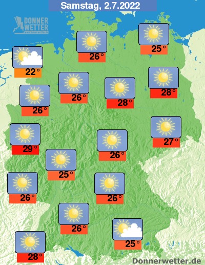 Heute präsentiert sich das Wetter verbreitet heiter bis sonnig, im Nordwesten und an den Alpen sind hier und da einige Wolken möglich, dabei bleibt es trocken. Die Temperatur steigt auf 22 Grad in Wilhelmshaven und bis 29 Grad in Bonn.