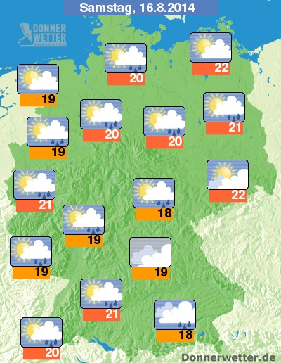 Der morgige Samstag zeigt sich insgesamt wiederum wechselhaft und eher kühl. Dabei kann vor allem vormittags aber auch zeitweise die Sonne scheinen, gebietsweise sind aber auch schon Schauer unterwegs. Am Nachmittag wird fast überall mit Schauern, vor allem im Osten und Nordosten auch mit einzelnen Gewittern zu rechnen sein. Dazwischen kann sich aber auch die Sonne zeigen. Die Temperatur steigt auf 18 Grad am Thüringer Wald und 22 Grad an der Ostsee.
