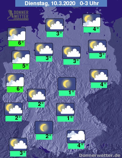 In der Nacht auf Dienstag überwiegt zunächst noch lockere oder aufgelockerte Bewölkung und es bleibt meist trocken, am Alpenrand fällt aus einer meist geschlossenen Wolkendecke etwas Regen.