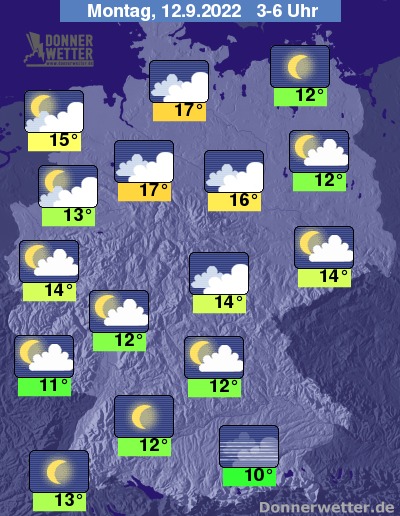 In der Nacht zum Montag zeigt sich der Himmel südlich des Mains und über Vorpommern meist sternenklar, sonst ist es oft locker, vor allem über der Norddeutschen Tiefebene aber auch stark bewölkt. Es bleibt landesweit trocken bei Tiefstwerten von 17 Grad in Hamburg und 10 Grad in München.