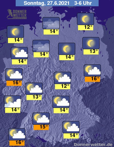 In der Nacht zum Sonntag lockert und klart der Himmel über dem Bundesgebiet verbreitet auf, dazu bleibt es trocken. Die Temperatur sinkt auf 16 Grad entlang des Rheins und bis 12 Grad an der Müritz.