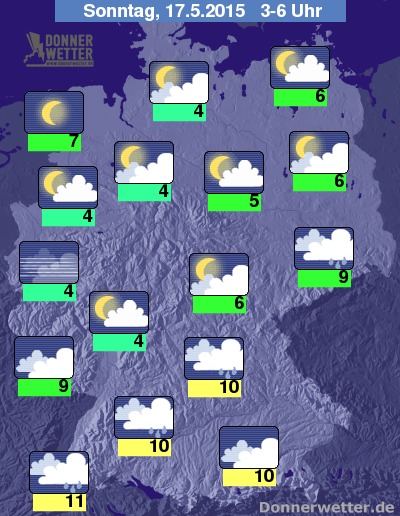 Am Sonntag ist es über der breiten Mitte vor allem vormittags häufig heiter, sonst zeigt sich der Himmel jedoch überwiegend wechselnd bis stark bewölkt, dabei bilden sich im Norden immer wieder auch Schauer, im übrigen Bundesgebiet bleibt es hingegen weitgehend trocken. Die Temperatur steigt auf kühle 12 Grad an der Nordsee und bis 17 Grad im Breisgau.