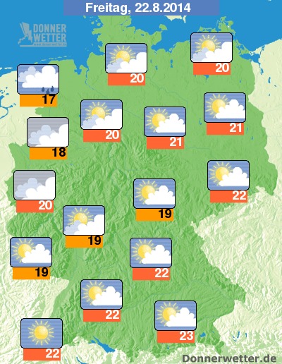 Heute scheint besonders im Süden und Osten noch häufig die Sonne zwischen meist nur lockeren Wolken, sonst ziehen meist schon mehr und vor allem im Nordwesten auch schon am Vormittag teils dichte Wolken durch, hier und am Alpenrand, am Abend auch im äußeren Norden und Westen sind gebietsweise Schauer und Gewitter möglich, sonst bleibt es aber weitgehend trocken. Die Temperatur steigt auf frische 17 Grad entlang der Ems und angenehm warme 23 Grad in Oberbayern.
