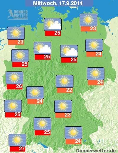 Der Mittwoch, es könnte der womöglich schönste, da sonnenscheinreichste Tag dieser Wetterwoche werden. Nach örtlicher Nebelauflösung scheint die Sonne vielerorts bis zu Ihrem Untergang. Einige, teils auch dichtere Wolken ziehen über den Norden des Landes, sowie in Alpennähe durch, hierbei sind vereinzelte Schauer und Gewitter möglich, sonst bleibt es trocken. Die Temperatur steigt auf 23 Grad auf Rügen und bis auf sommerliche 27 Grad im Raum Freiburg.