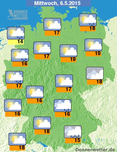 Heute bleibt es im Südosten bis in den späten Nachmittag hinein weitgehend bedeckt und es fällt immer wieder, teils langanhaltender Regen. Im Osten bleibt es zumeist stark, teils auch aufgelockert bewölkt und dazu trocken. Im übrigen Bundesgebiet ist es hingegen zunächst verbreitet heiter bis sonnig und trocken. Am Nachmittag ziehen von Westen her jedoch teils dichte Quellwolken auf und in der Westhälfte des Landes, gegen Abend auch in der Osthälfte können sich Schauer und auch einzelne Gewitter entwickeln. Die Temperatur steigt auf 14 Grad an der Nordsee und bis 19 Grad in Berlin.
