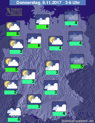 Am Donnerstag zieht zum Teil starke, teils lockere bis aufgelockerte Bewölkung durch, dabei fällt im Süden gebietsweise Regen, im übrigen Bundesgebiet bleibt es jedoch weitgehend trocken. Die Temperatur steigt auf 6 Grad im Grabfeld und bis 11 Grad in Emden.