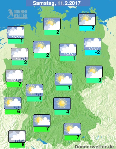 Heute zeigt sich vor allem von Bayern über Thüringen bis nach Sachsen häufig die Sonne und hier bleibt es weitgehend trocken. In den anderen Landesteilen ziehen dagegen überwiegend dichte Wolken durch, dazu fällt besonders im Norden und Westen, jedoch auch über Berlin-Brandenburg und vom Schwarzwald bis zum Saarland gebietsweise Schnee, Schneeregen oder Regen. Vielerorts besteht Glättegefahr! Die Temperatur steigt auf -2 Grad an der Müritz und bis 8 Grad in Stuttgart.