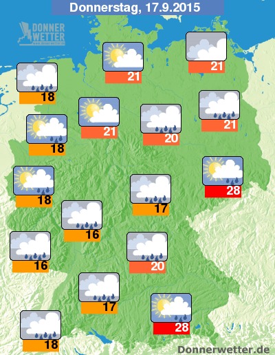 Heute gibt es zumeist einen Wechsel aus Auflockerungen und oft auch dichter Bewölkung, dabei fällt besonders von der Mitte bis in den Südwesten Deutschland häufig Regen, dazu sind die Niederschläge zum Teil kräftig, langanhaltend und ergiebig. In den anderen Landesteilen fällt zeitweise Regen. Im Norden bleibt es jedoch überwiegend trocken. Die Temperatur steigt auf kühle 16 Grad am Pfälzer Wald und bis auf sommerliche 28 Grad an der Neiße. Im Norden weht teils starker bis stürmischer Wind mit möglichen Sturmböen, an Nord- und Ostsee herrscht zum Teil auch Sturm.
