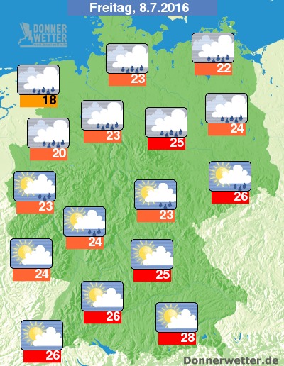 Die Temperaturen erreichen am Freitag Werte um 18 Grad C im äußersten Nordwesten und um 28 Grad C in Oberbayern.