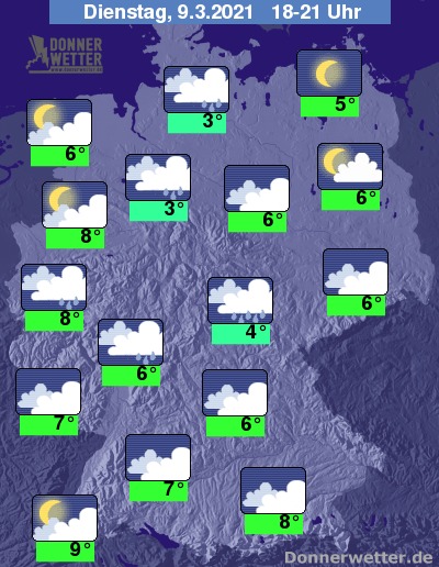 In den Abendstunden zeigt sich der Himmel vor allem im Umfeld der Küsten sowie später auch in der Westhälfte überwiegend locker oder aufgelockert bewölkt, an der Ostseeküste ist es zeitweise auch klar. In den übrigen Landesteilen bleibt die Wolkendecke zumeist geschlossen und vor allem auf einem Streifen von der Lüneburger Heide bis ins Altmühltal muss zeitweise mit Regen-, Schneeregen- oder Schneeschauern gerechnet werden.