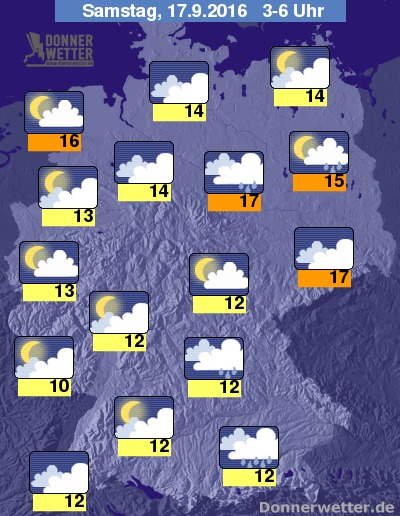 In der Nacht zum Samstag fällt im Südosten und Nordosten unter meist dichten Wolken zeitweiliger, zum Teil auch kräftiger und langanhaltender Regen. Im übrigen Bundesgebiet ist es meist wechselnd, teils jedoch auch stark bewölkt, dazu bleibt es weitgehend trocken. Die Temperatur sinkt auf 17 Grad in Görlitz und bis 10 Grad im Saargau.