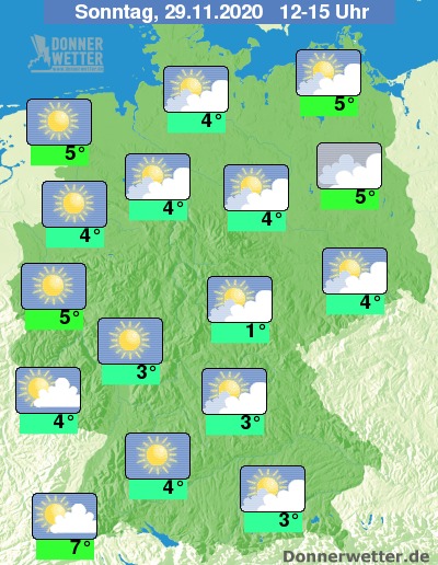 Heute Nachmittag ist es zum Teil stark bewölkt oder trüb, in weiten Landesteilen zeigt sich aber auch die Sonne, dabei bleibt es trocken. Die Temperatur liegt bei 1 Grad in Erfurt und bis 7 Grad in Freiburg.
