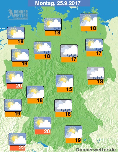 Am Dienstag halten sich vor allem vom Osten bis in den Nordosten dichte Wolken mit gebietsweisem Regen, sonst ist es besonders über der Südwesthälfte häufig heiter, teils aber auch mal stark bewölkt, es bilden sich örtlich Schauer oder Gewitter. Die Temperatur steigt auf 18 bis 23 Grad.