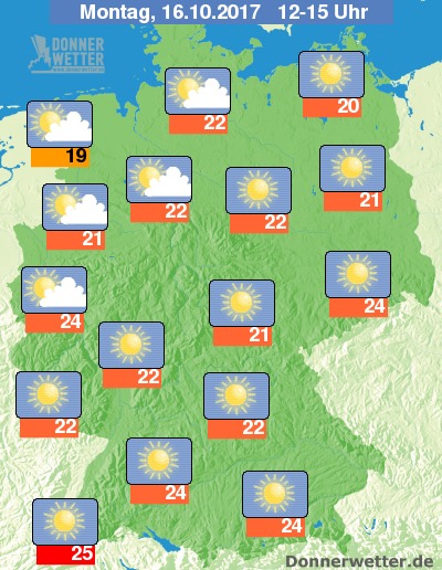 Heute Nachmittag strahlt die Sonne über dem Großteil der Bundesrepublik ungestört vom Himmel. Lockere Wolkenfelder ziehen vor allem über den Nordwesten des Landes hinweg. Es bleibt überall trocken bei Werten zwischen 19 Grad an der Nordsee und bis 25 Grad im Oberrheingraben.