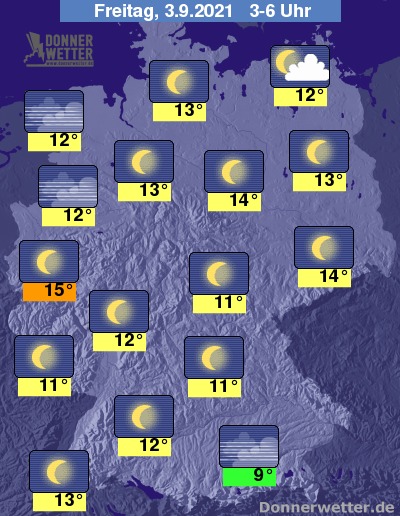 In der Nacht zum Freitag zeigt sich der Himmel bundesweit sternenklar, dazu bleibt es trocken. Die Temperatur sinkt auf 15 Grad in der Kölner Bucht und bis 9 Grad in Augsburg.