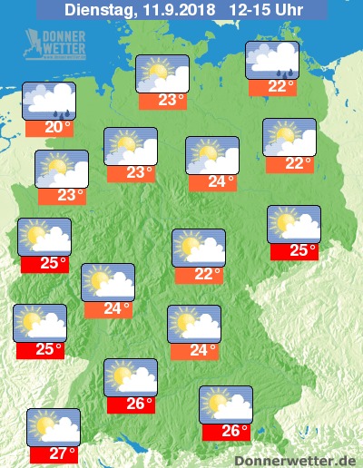 Direkt an der Küste von Nord- und Ostsee, sowie über Schleswig-Holstein kann es aus kompakten Schichtwolken gelegentlich regnen. Dazu liegen die Temperaturen am frühen Nachmittag um, oder etwas unterhalb der 20 Grad - Marke. Im großen Rest unseres Landes dominiert jedoch freundliches Spätsommerwetter mit meist nur leichter oder mäßiger Bewölkung und zeitweiligem Sonnenschein. Dazu gibt es Temperaturen zwischen 21 und 28 Grad.