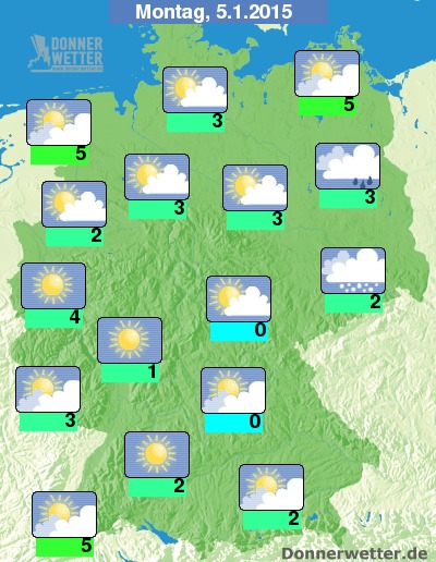 Am Montag halten sich vor allem im Osten und Südosten Deutschlands meist dichte Wolken, dazwischen kann es aber auch mal auflockern, es fällt zeitweise etwas Schnee oder Schneeregen, in Berlin-Brandenburg auch Regen. In den anderen Landesteilen ist es hingegen oft aufgelockert, zum Teil aber auch stark bewölkt, jedoch trocken. Besonders im Westen und Südwesten wird es gebietsweise sonnig. Die Temperatur steigt auf 0 Grad im Coburger Land und bis 5 Grad im Küstenumfeld.