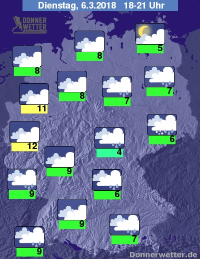 Heute Abend ziehen dichte Regenwolken über Bayern, Thüringen, Sachsen, Sachsen-Anhalt und Berlin-Brandenburg hinweg, dazu ist zum Teil auch Schneeregen oder Schnee möglich. Im übrigen Bundesgebiet ist es ebenfalls überwiegend bedeckt, dazu jedoch meist trocken. Die Temperatur liegt zwischen 4 und 12 Grad.