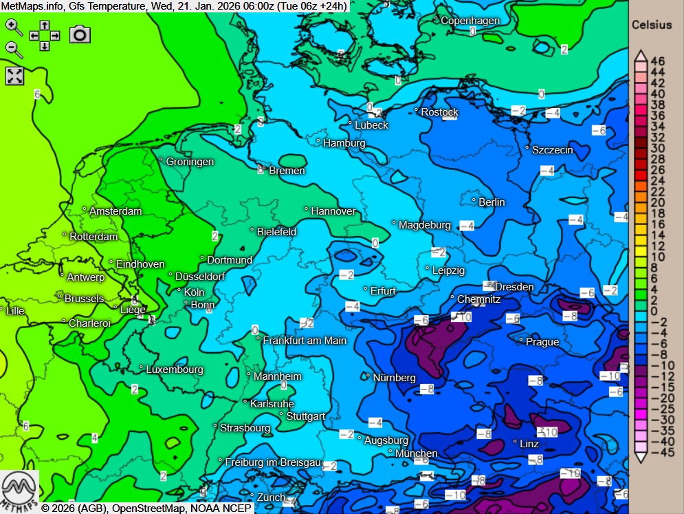 Die Temperatur- / Wetterkarte für Mittwochfrüh (06:00 Uhr) nach GFS:
