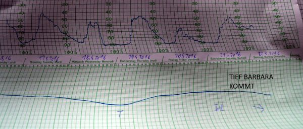 Unser Meteogramm (Bild unten) zeigt den fallenden Luftdruck seit Samstagnachmittag durch Tief Barbara. Das Zwischenhoch Reimer ist schon wieder Geschichte.