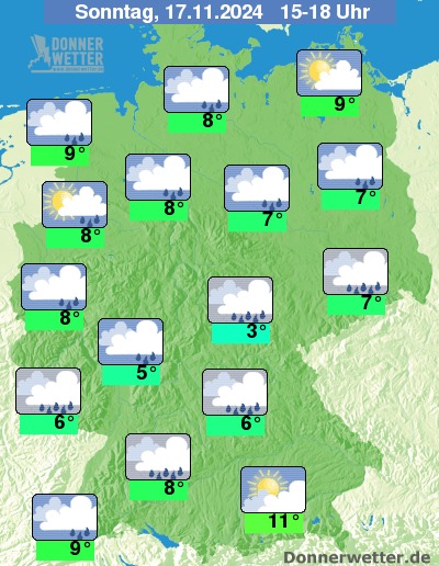 Am Sonntagnachmittag zeigt sich der Himmel über weiten Landesteilen stark bewölkt oder bedeckt. Dabei fällt verbreitet Regen, in den Höhenlagen der Mittelgebirge auch Schnee. Lokale Auflockerungen sind am Nachmittag vor allem in der Nordhälfte und am Alpenrand möglich.