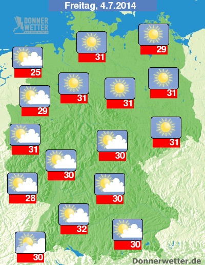 Am Freitag startet fast überall noch verbreitet mit viel Sonnenschein. Von Südwesten nehmen die Wolken aber stetig zu und zum Nachmittag und Abend besteht hier ein leichtes bis mäßiges Schauer- und Gewitterrisiko. In der Nordosthälfte bleibt es dagegen bei häufigem Sonnenschein weitgehend trocken. Die Temperaturen klettern auf sommerliche bis hochsommerliche Werte zwischen 25 Grad in Emden und 32 Grad im Raum Karlsruhe.