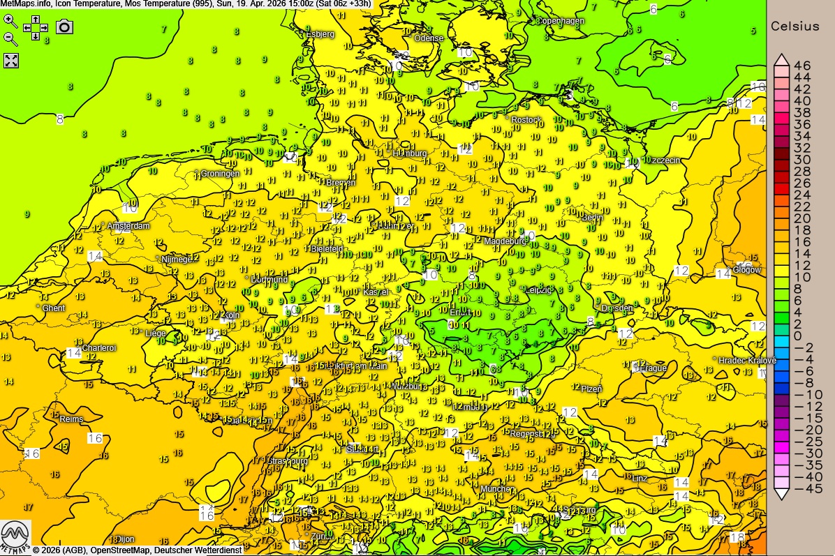 Die Wetterkarte für 06:00 Uhr, die Lufttemperaturen für 15:00 Uhr und die 24-Stunden-Regenmengen für Sonntag nach ICON: