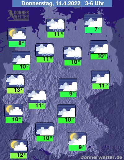 Am Donnerstag zeigt sich der Süden noch meist heiter und trocken, sonst ist es aber überwiegend stark, teils ist es aufgelockert bewölkt. Es bilden sich lokale Schauer, selten entwickeln sich auch Gewitter. Die Temperatur steigt auf 13 Grad in Aurich und bis 22 Grad in Freiburg.