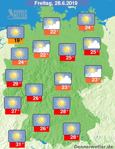 Nach einer zum Durchlüften geeigneten Nacht, erwärmt sich Luft im Laufe des Nachmittags wieder auf Werte von 19 bis 26 Grad im Norden und Nordosten, sowie auf hochsommerliche 26 bis 32 Grad im Süden und Südwesten.