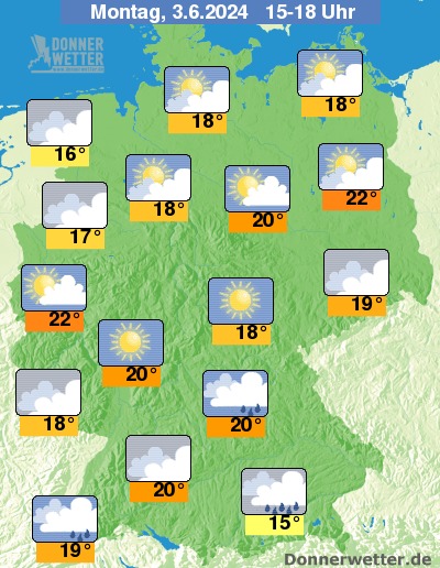 Am Montagnachmittag sind im Süden und Südosten immer wieder Schauer möglich, auch lokale Gewitter können nicht ausgeschlossen werden. In den übrigen Landesteilen ist der Himmel am Nachmittag verbreitet wolkig und es bleibt meist niederschlagsfrei.