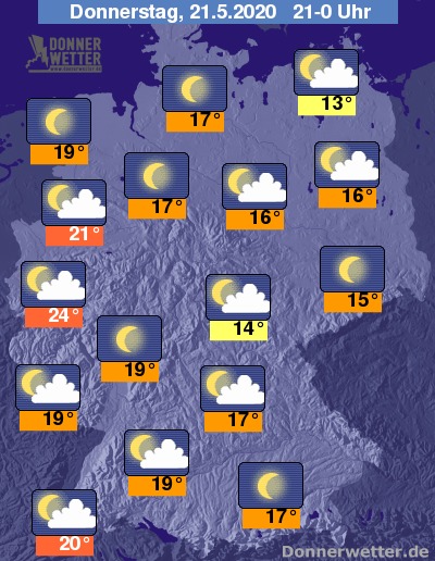 Während der zweiten Nachthälfte trübt sich der Himmel an den Küsten ein, sonst bleibt es meist nur leicht bewölkt, im Osten häufig auch sternenklar. Im südlichen Bayern, dort wo zuvor ein Gewitterguss niederging, sowie entlang der Donau können sich stellenweise Nebelfelder bilden.